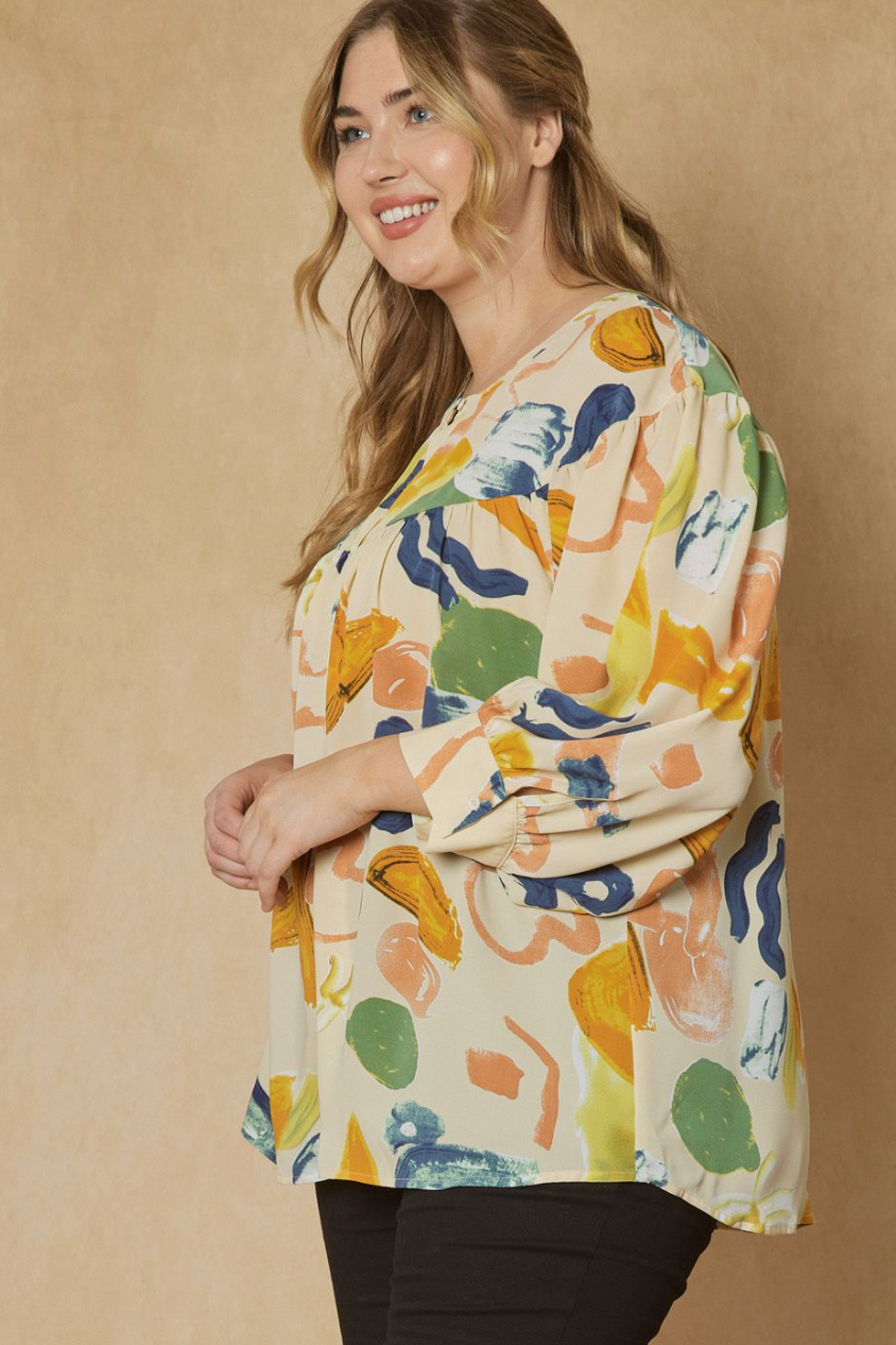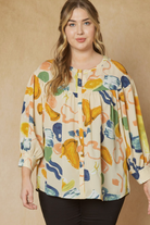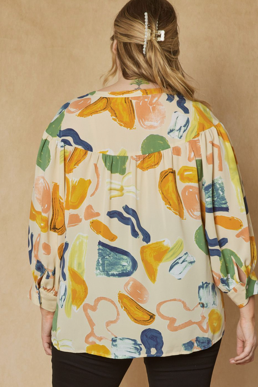 Print round neck long sleeve button up top featuring button closure at sleeves. Unlined. Woven. Non-sheer. Lightweight.