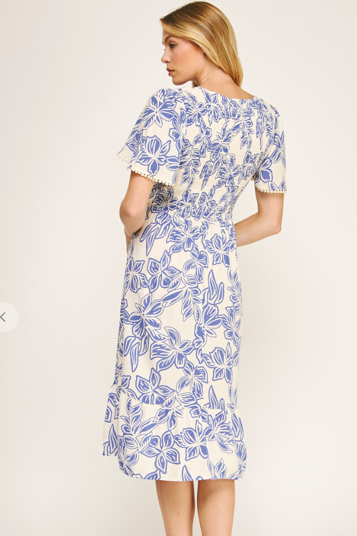 Step into effortless charm with this sun-kissed midi dress crafted from soft, flowing printed rayon challis. Smocked detailing at the bodice and delicate trim on the flutter sleeves add subtle texture, while playful pom-poms at the cuffs bring a whimsical, vacation-ready touch. Perfect for beachside strolls, sunset dinners, or any day you want to feel light, breezy, and radiant.