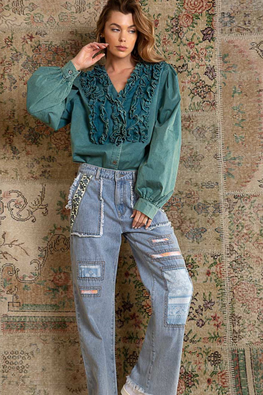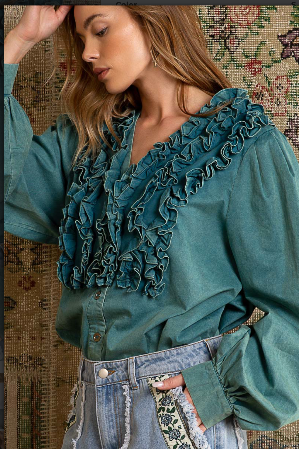 Designed in V-neck, long sleeve, oversized fit, button down shirt. Featured in poplin with sewn on ruffle detailing along the neckline.