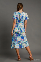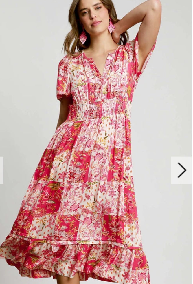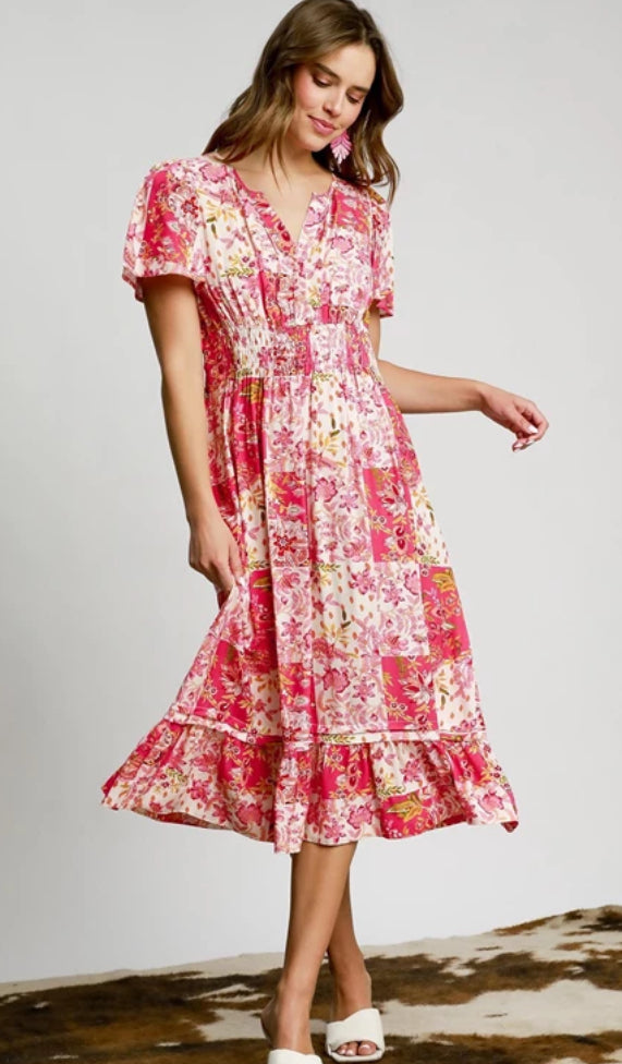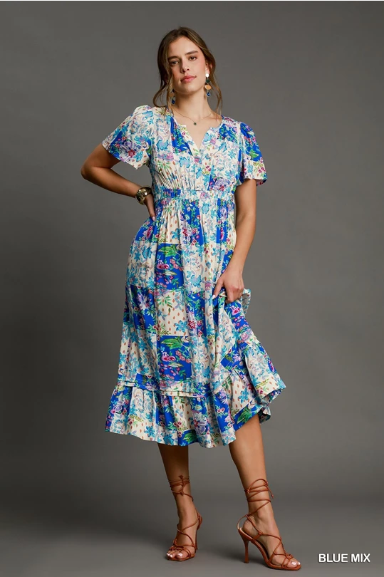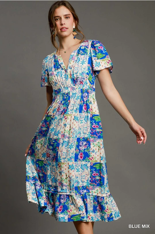 Patchwork Floral Smocked Midi Dress
