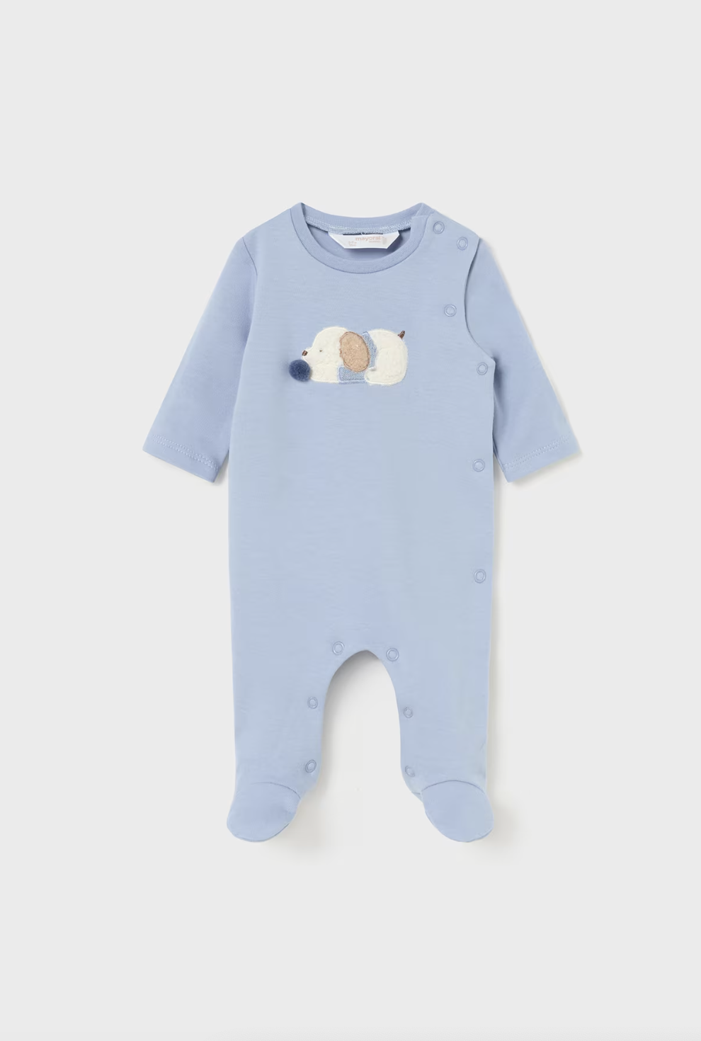 Baby boy footies with snaps featuring a playful puppy on a long sleeve