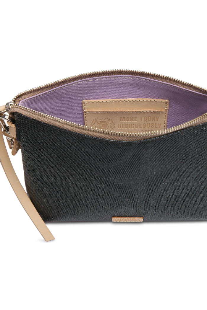 Includes detachable and adjustable woven crossbody strap