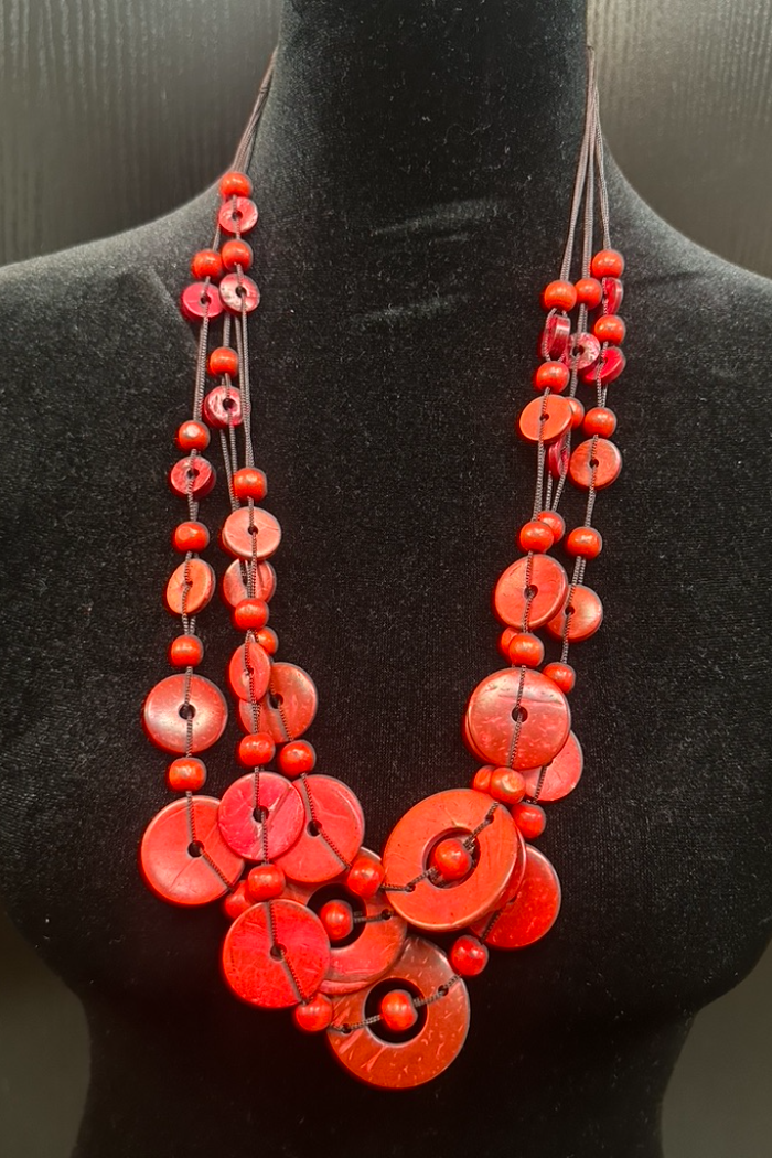 Make a statement in this red wooden disk necklace with multiple layers
