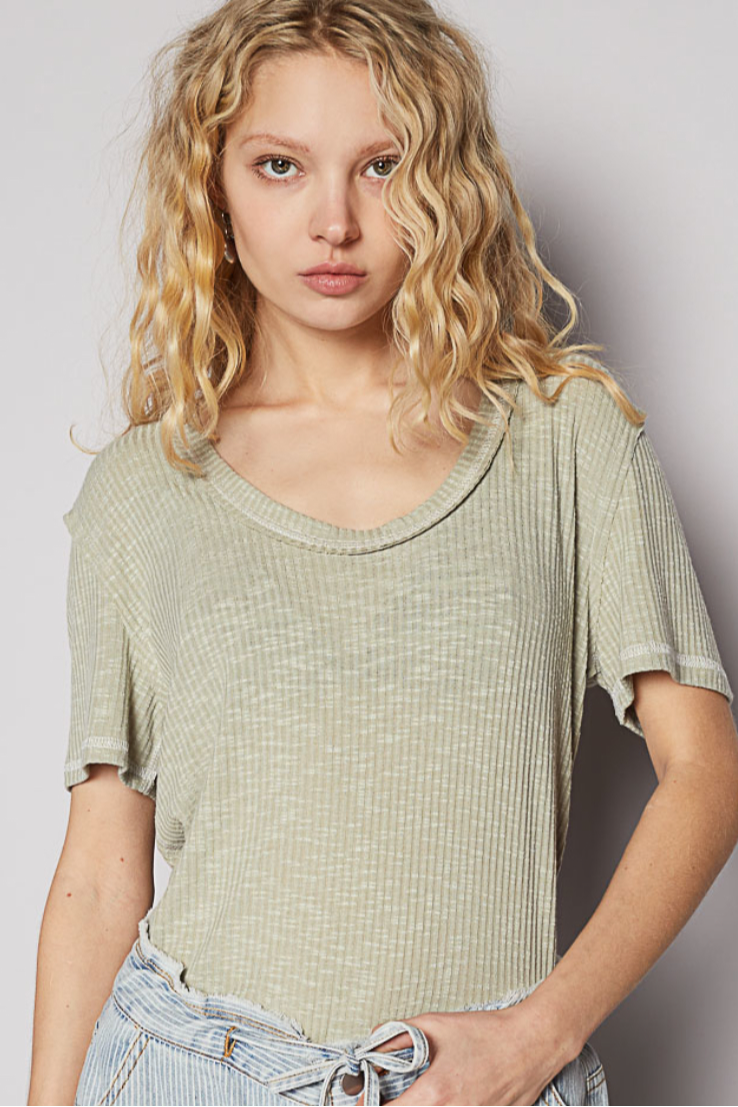 Designed in round neck short sleeve roomy fit top in ribbed jersey contrast overlock stitching.
