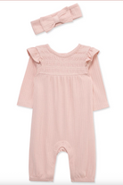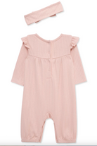 Little Me's adorable jumpsuit and headband create a go-to outfit . This two-piece set includes a long-sleeve jumpsuit with ruffles and a matching bow headband.