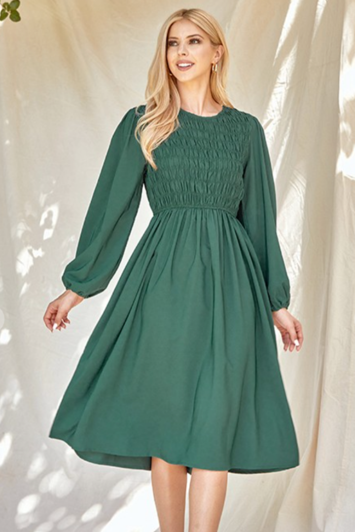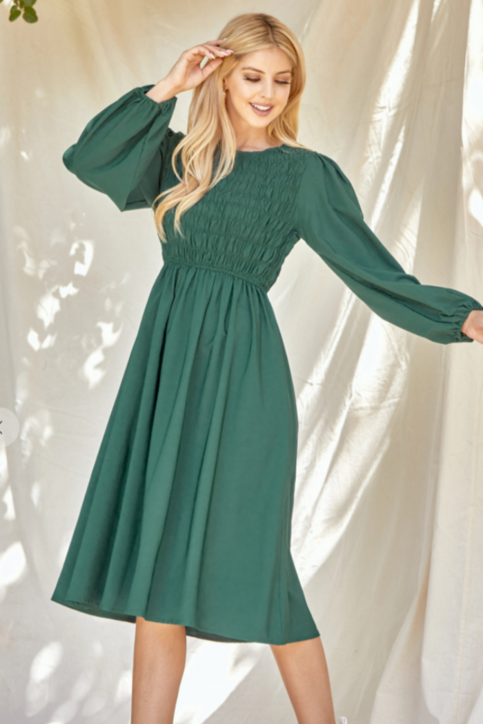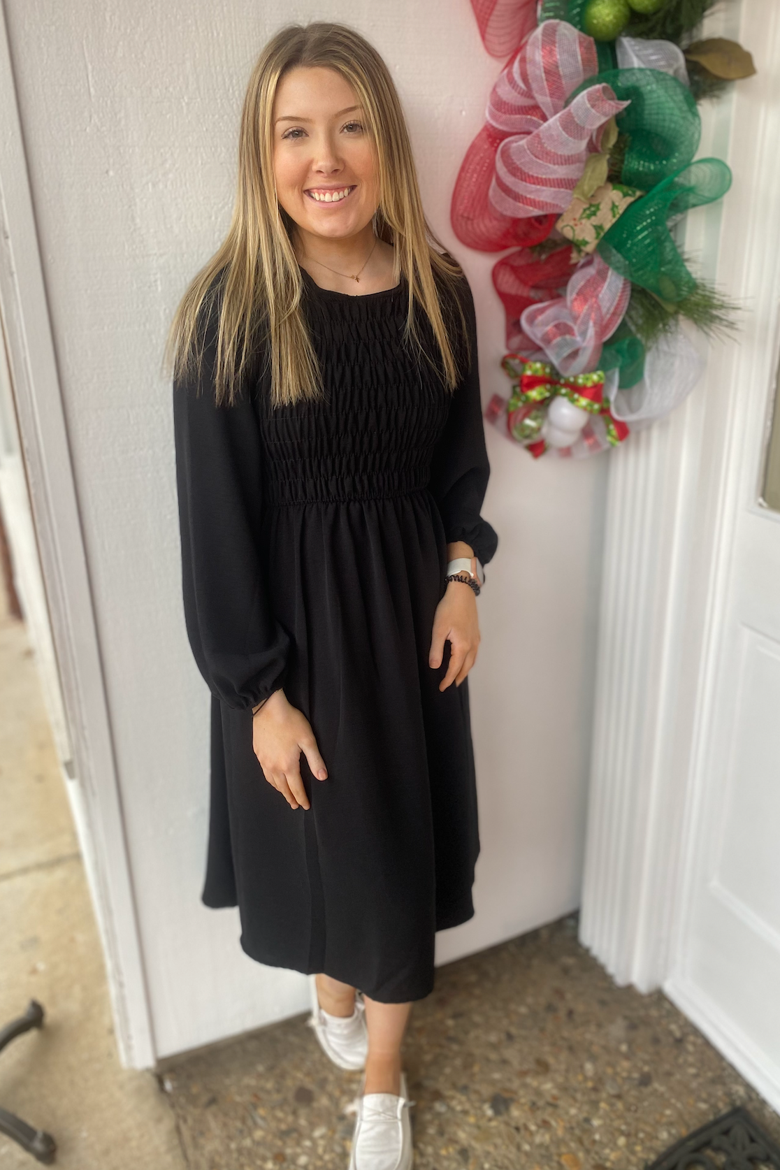 Solid black dress with a round neck, puffed shoulders, balloon sleeves and smocked top