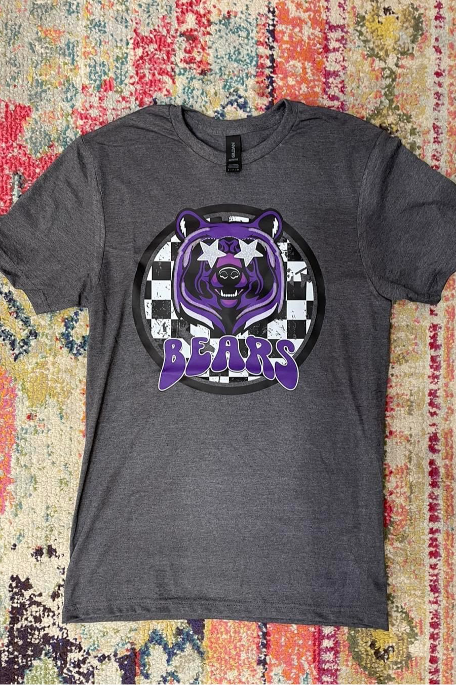 Locally made UCA BEARS womens tshirts with checkered background and fun star eyes, a fun way to show your Razorback pride!