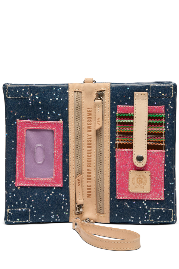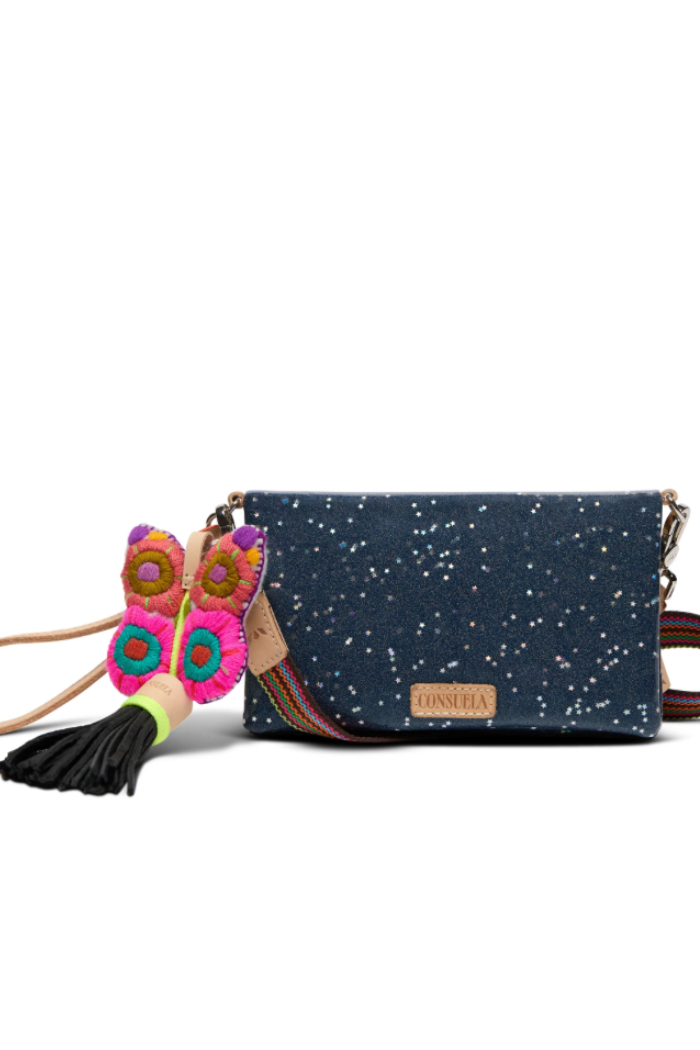 Included detachable wristlet strap and adjustable woven crossbody strap