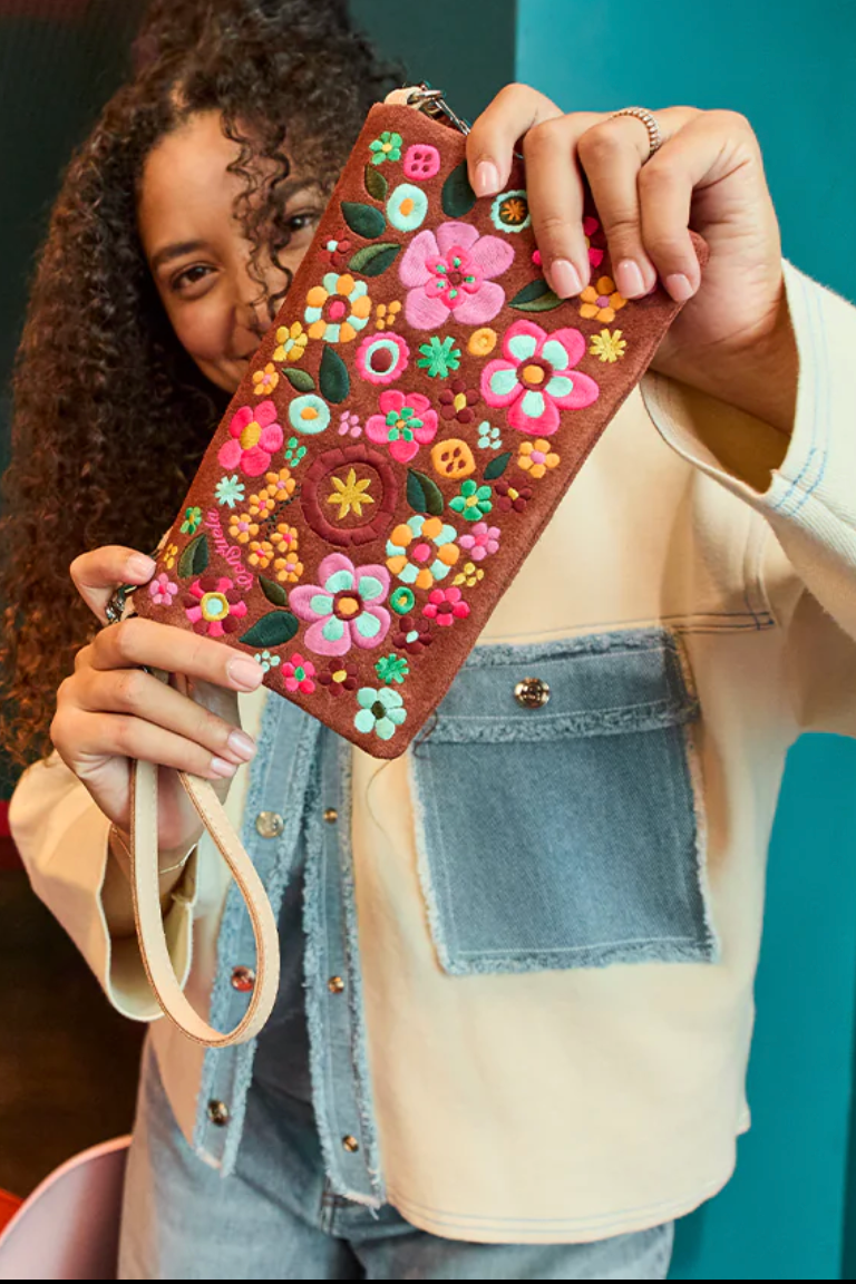 Embroidered floral on a Sienna suede exterior