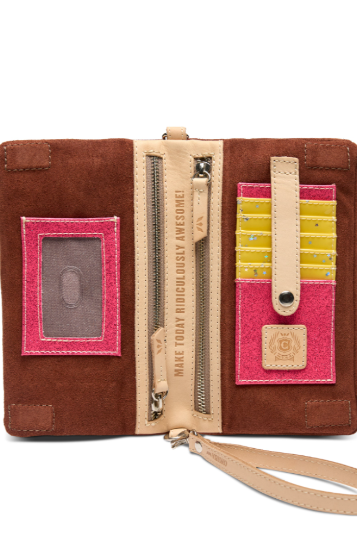 Included detachable wristlet strap and adjustable woven crossbody strap