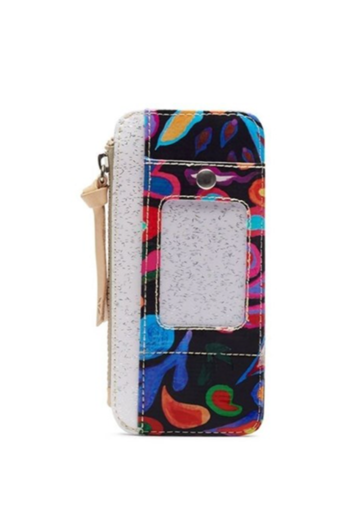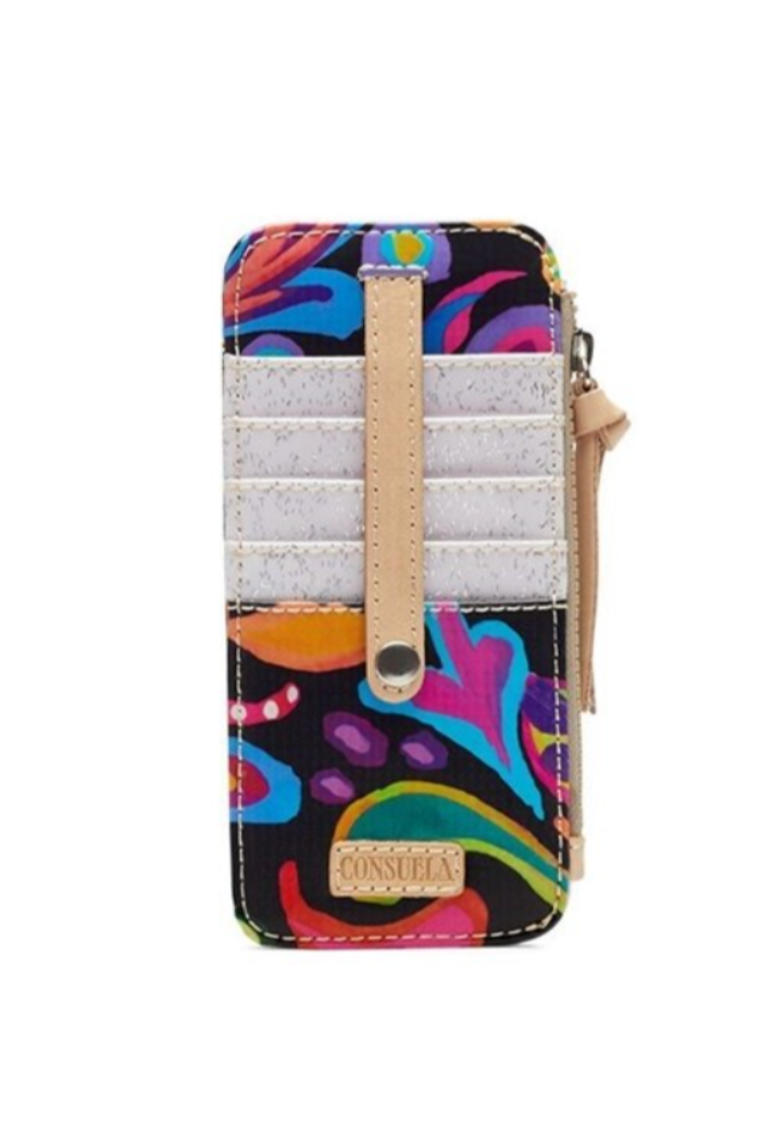 Keeping things light and easy, the card organizer is perfect for credit cards and folded bills. This wallet's snapclosure and zipper compartment provides security while you take on the day. Five card slots and ID pocketCash zipper compartmentSnap flap to keep cards secureTrimmed in natural, untreated leatherFeatures our Sophie ConsuelaCloth exterior
