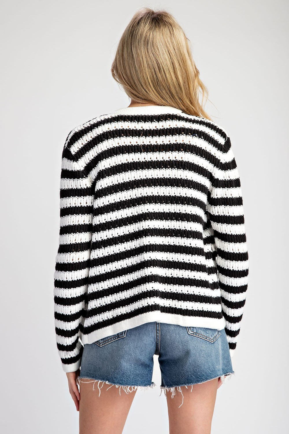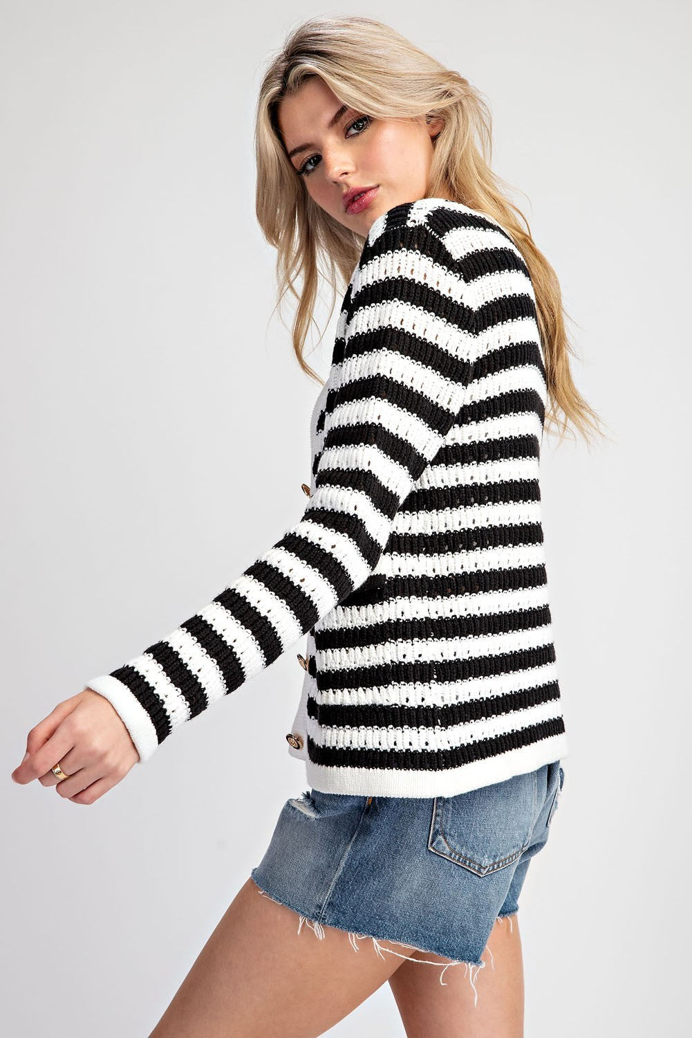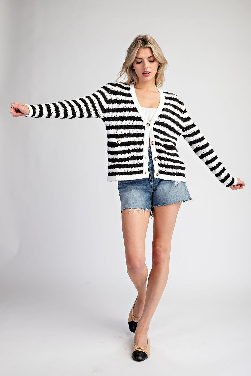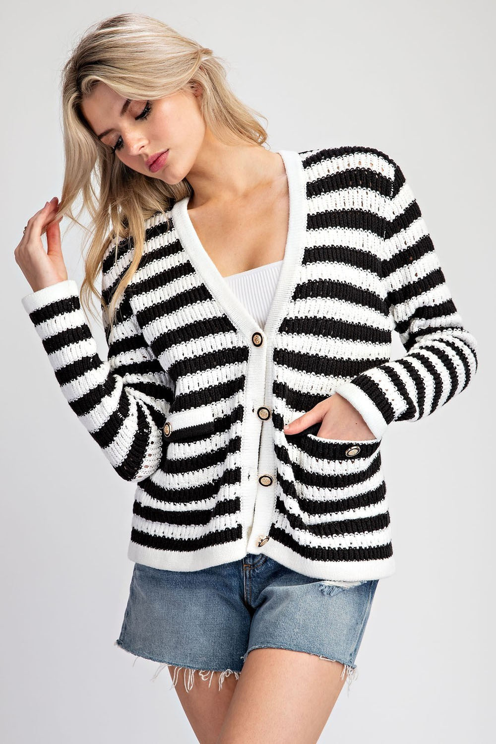 Striped knit cardigan featuring a button down front, a V-neckline and two front flap pockets.
