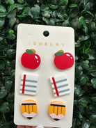 The perfect stud earring pack for teacher with apple, paper and pencil stud earrings