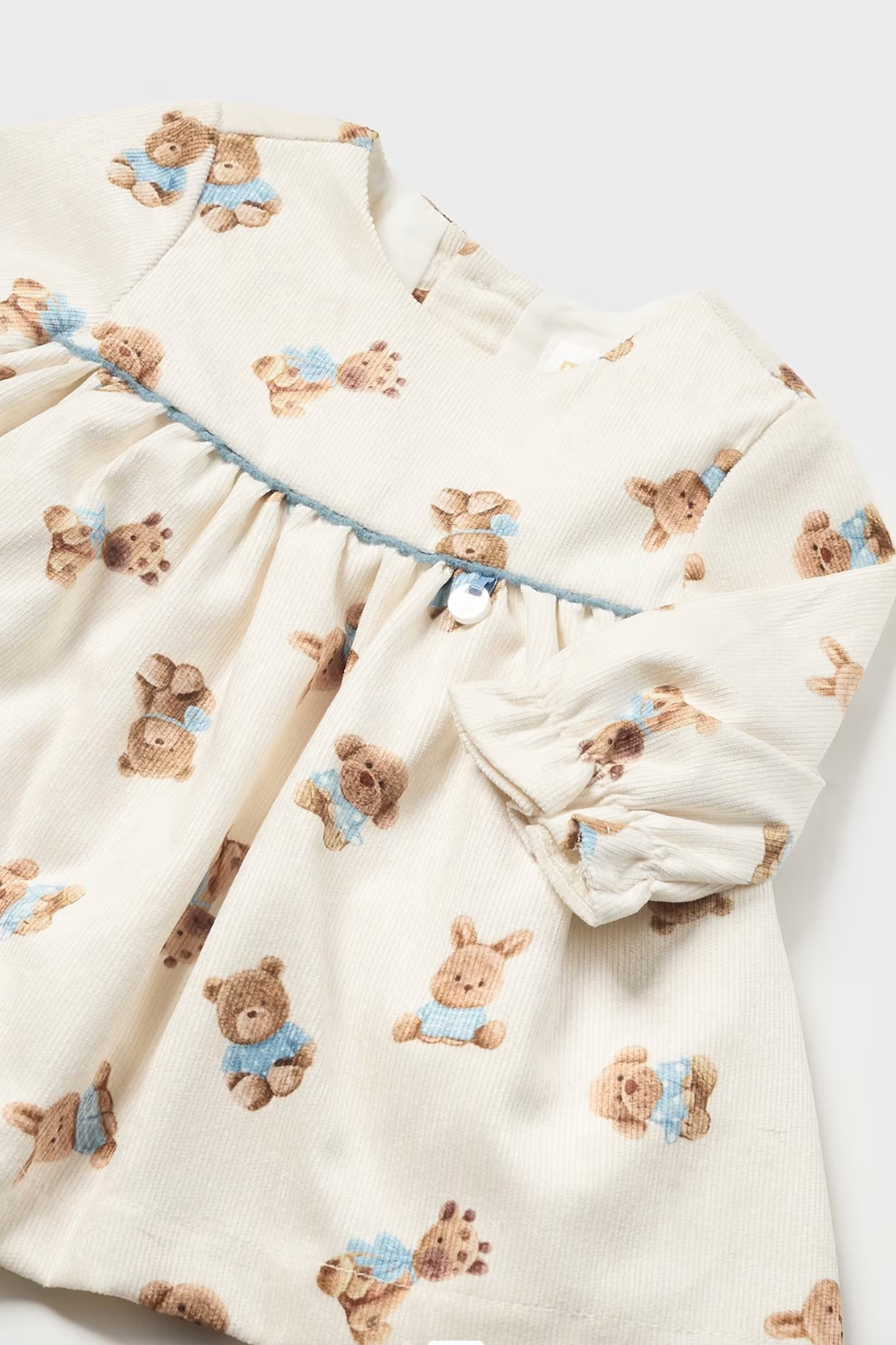 Baby girl teddy bear dress with long sleeves ruffle cuff back buttons and tier