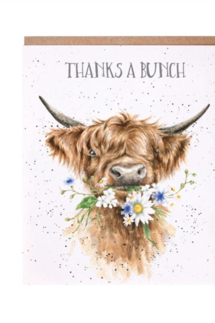 Thank someone with this card which features a lovely Highland cow with a mouth full of flowers and reads 'Thanks a Bunch.' The card is printed on beautiful textured, sustainably sourced board and is supplied wrapped with a recycled kraft envelope. It measures 6.77 x 4.84 inches. Message inside reads 'I'm so grateful.'