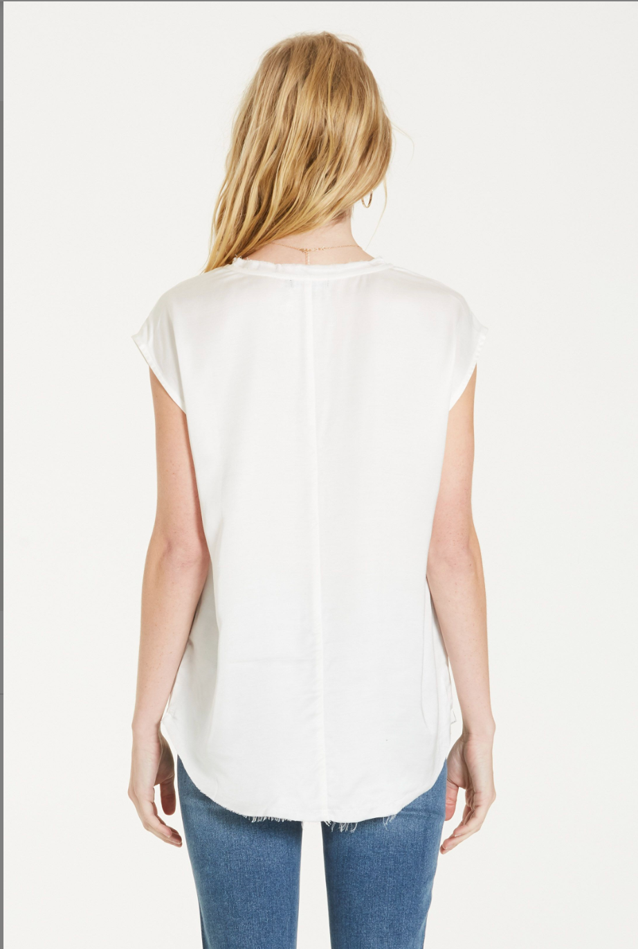 Frayed neck & hem, v-neck top finished sleeveless. Relaxed fit, styled with center back seam.